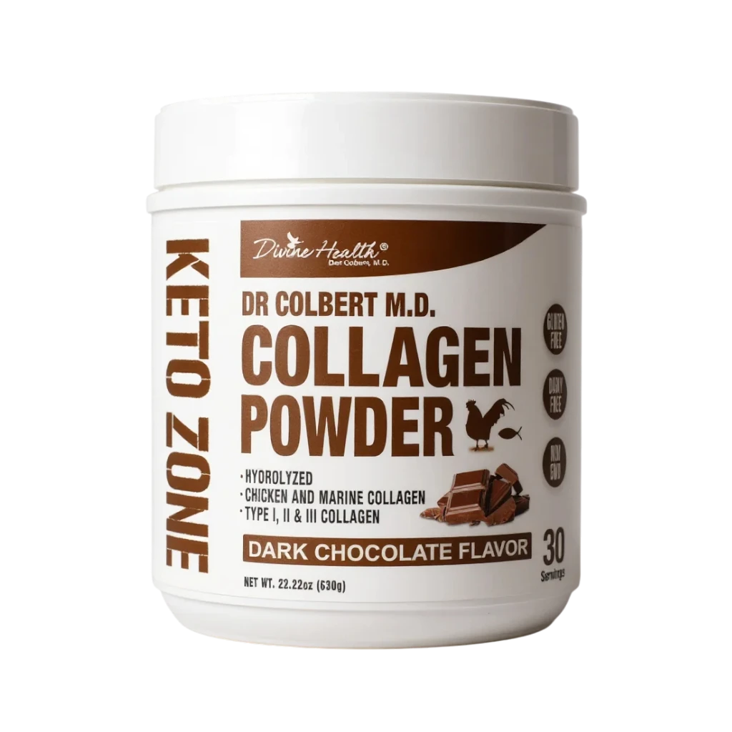 Fuel your body with clean collagen support. Dr. Colbert’s Keto Zone Collagen Powder delivers Types I, II & III collagen sourced from chicken and marine peptides. Hydrolyzed for optimal absorption, this formula mixes easily into coffee, shakes, or recipes to help support healthy joints, radiant skin, strong hair & nails, and daily vitality.